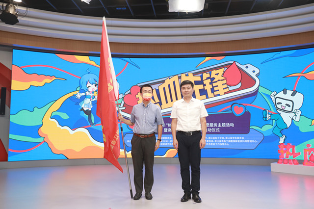“热血先锋”在行动,2021年高校感恩季献血活动正紧锣密鼓地开展,本次活动的第一站是杭州电子科技大学,共青团浙江省委盛乐副书记为首家活动高校授旗,并由杭州电子科技大学校医院周杭院长上台接旗。