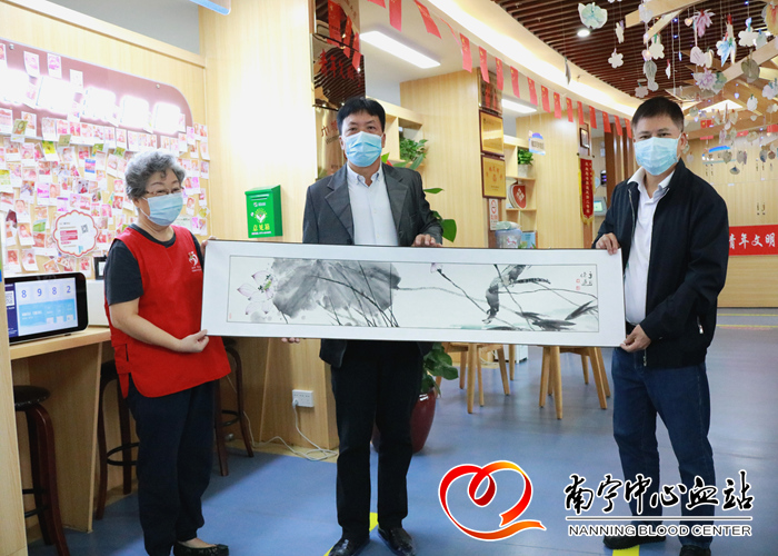活动上,广西美术家协会会员、南宁市美术家协会副主席李德道教授携带自己创作的10幅作品前来给爱心市民送祝福,讲到自己参与无偿献血这一爱心公益行为,深受老年大学学员们的影响。“今天虽然是孝老敬老的日子,但是我们这帮老人家闲不住,继续发挥余热,用行动支持无偿献血,希望更多人能团聚。”老年大学学员的一番真挚话语也感动了前来献血的爱心市民。献完血的李女士表示,重阳节献血能拿到精美的字画觉得很有意义,希望向老年大学的叔叔阿姨们学习,加入无偿献血的宣传队伍,将爱一直传递和传承下去。