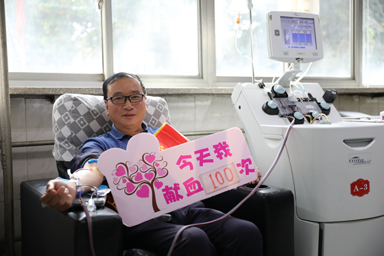 滴滴热血传真情。19年间,他默默无闻、无私奉献,用热血托起生命的希望。他就是我市第四十位献血满百次的献血达人刘爱军。从第一次参加无偿献血到现在,他捐献全血10次4000毫升,捐献机采血小板90次174.5个治疗量,还多次荣获全国无偿献血奉献奖金奖、银奖、铜奖。