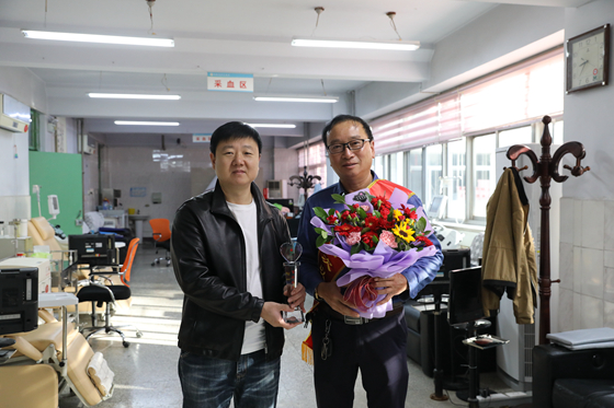10月11日上午,血站工作人员在血站二楼机采科见证了这位无偿献血志愿者的第一百次无偿献血。当天献血结束后,市中心血站副站长王勇为刘爱军颁发了“百次献血达人”荣誉证书和奖杯,并送上鲜花表示祝贺。数字和荣誉的背后是刘爱军长达19年的坚持。刘爱军说:“荣誉是对我的激励,只要允许我献血,我会义无反顾地坚持下去。无偿献血是利国利民的好事,能为社会做贡献,我非常自豪!”
