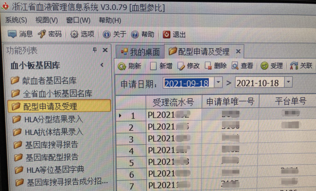 2009年,经过实验比对论证、数据需求整理等充分准备,浙江省血液中心正式筹建血小板基因数据库。2017年,基因数据库不断扩充和完善,并在全省范围内推广和应用。2021年5月,依托浙江血液云平台信息系统,完成12个地市采供血机构数据并库。并库后的全省数据库,依托浙江省血液管理信息系统血型参比模块血小板基因库软件,实现全省采供血机构开放共享,同时向全省医疗机构开放血小板基因配型服务。