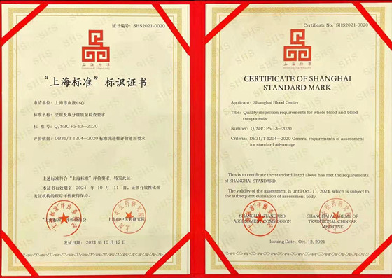 上海市血液中心(以下简称“中心”)的企业标准《全血及成分血质量检查要求》入选2021年“上海标准”名单。该标准的安全性和有效性关键指标均达到国内领先、国际先进水平,标准的推广和实施为上海建成“全球健康城市典范、全球公共卫生体系最健全的城市之一”提供了有力的支撑。