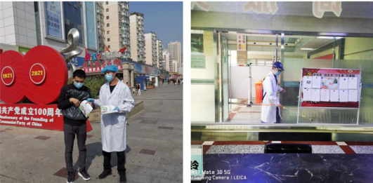 中心党员开展街头无偿献血宣传和在一线进行消杀