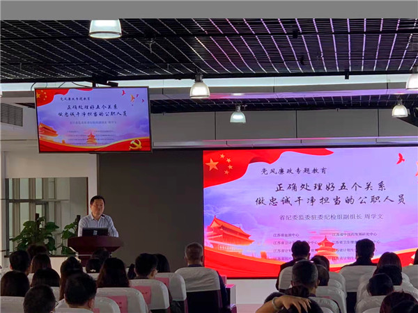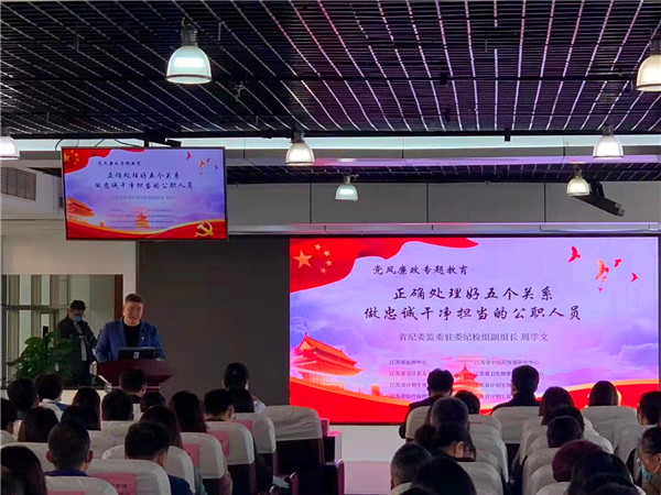 10月25日上午,江苏省血液中心联合省中医药发展研究中心、省卫计委人才服务中心、省卫生健康发展研究中心、省计划生育宣传教育所、省计划生育药具管理站、省医疗管理服务指导中心、省计划生育协会等八家单位在省血液中心业务楼八楼学术报告厅举办党风廉政专题教育宣讲会。宣讲会邀请省纪委监委派驻省卫生健康委纪检监察组副组长周学文到会作题为《正确处理好五个关系 做忠诚干净担当的公职人员》党风廉政专题教育报告。省血液中心党委书记、主任丁文艺主持报告会。