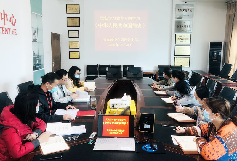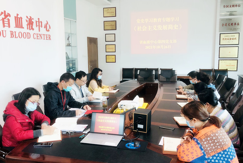 10月26日,贵州省血液中心第四党支部召开党员大会,开展党史学习教育专题学习,组织支部党员集中学习《中华人民共和国简史》和《社会主义发展简史》,不断深化党史学习教育和“四史”宣传教育。