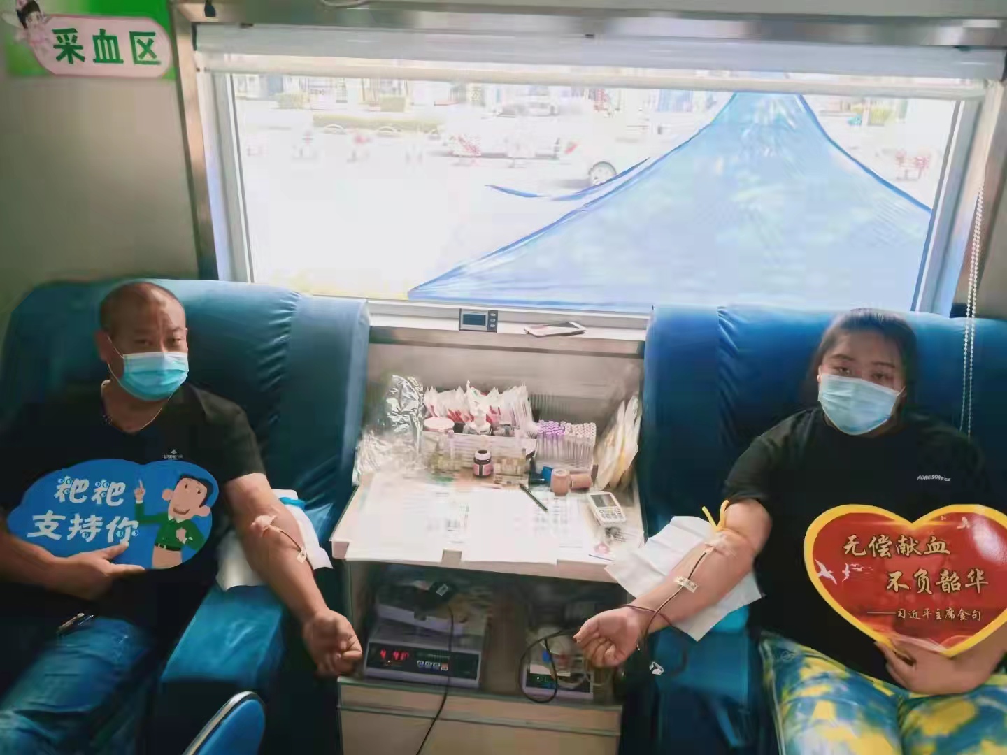 走上献血车,我的心情格外激动。我和爸爸做了献血前化验,化验结果均符合献血标准。献血虽然对于我来说已经是轻车熟路,但爸爸是第一次献还需要我为他加油打气。