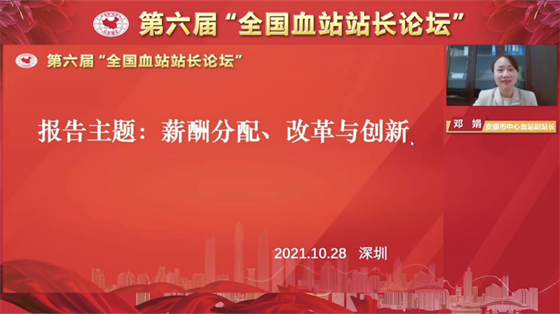 为加强全国血站的经验交流与合作,2021年10月27日至28日,第六届 “全国血站站长论坛”在深圳市举办。中国输血协会理事长、世界卫生组织输血合作中心主任朱永明,深圳市卫健委二级巡视员林汉城等相关领导出席并致辞。此次论坛的主题是“血站建设与发展、改革与创新”,来自全国各省、市血液中心(血站)的同仁通过线上方式参加会议。安康市中心血站副站长邓娟作为全国血站六个优秀论文交流发言人之一,就安康血站绩效分配、改革与创新工作在会上进行了经验交流。