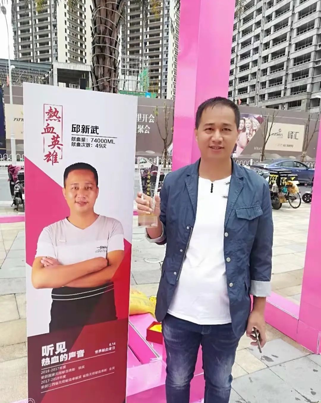 2015年邱新武生日这天,和献血阔别18年,他走入上饶市中心广场献血屋,再一次参与到无私奉献中。之后,在了解到还可以捐献机采血小板后,又开始了每月两次的机采血小板之行。迄今为止,他已参与无偿献血73次,机采血小板140个治疗量,全血400毫升!