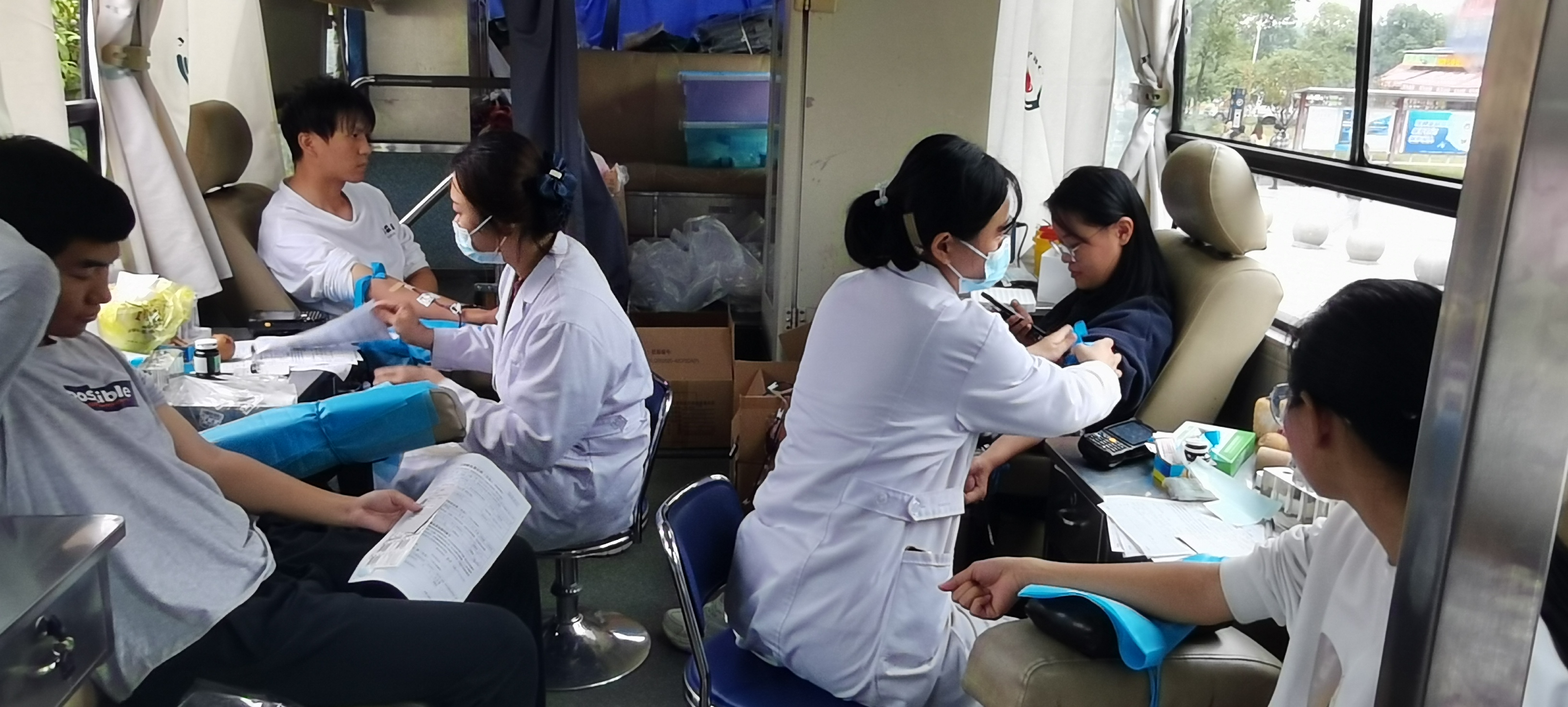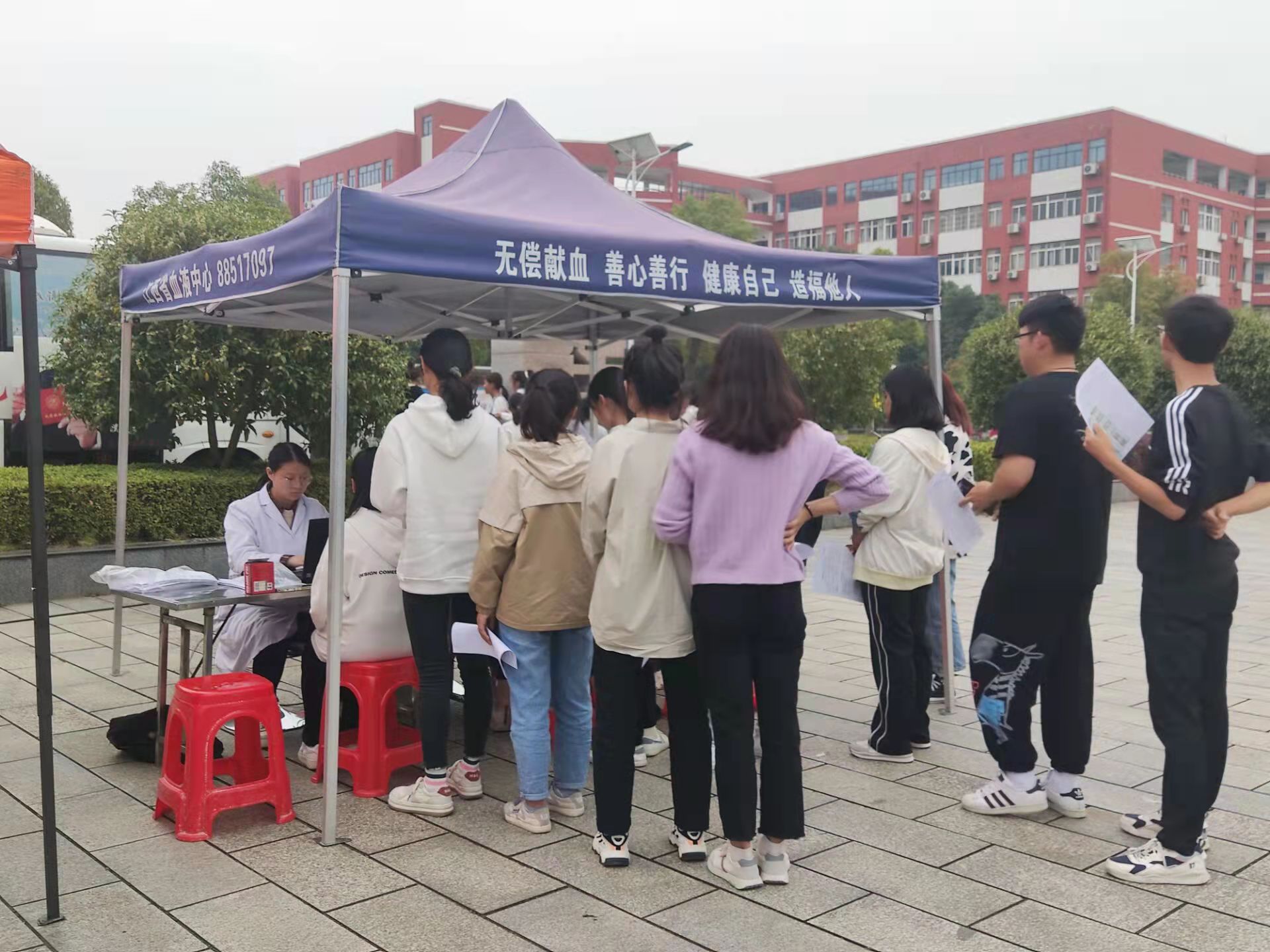 29日上午10:00,江西省血液中心献血车准时到达学校大学生活动中心门口,青年志愿者同学已经搭好帐篷,摆好桌椅。前来献血的同学们依次扫健康码,测量体温,然后填写无偿献血登记表。虽然献血人数很多,但现场秩序井然,大家依次排队参加体检、化验、献血。