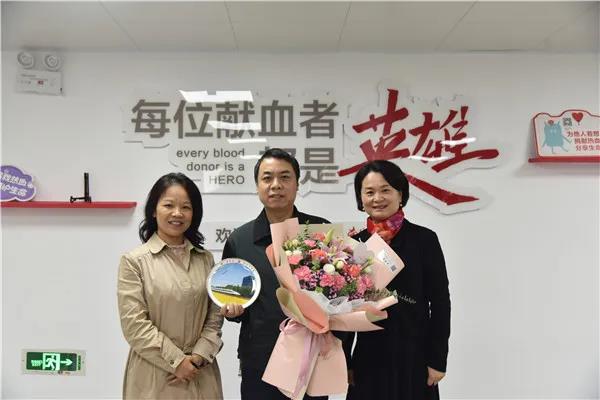 血站党总支书记、站长刘昕晨(右),副站长刘娟(左)来到现场为他献上了鲜花,表示感谢