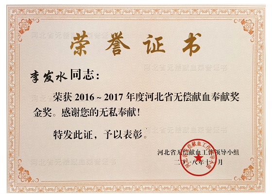 李发水是一名有着25年党龄的老党员。荣获2012-2013年度全国无偿献血奉献奖铜奖,2014-2015年度全国无偿献血奉献奖银奖,2016-2017年度河北省无偿献血奉献奖金奖,2018-2019年度全国无偿献血奉献奖金奖,至今已累计献血26次,10400毫升......一张张红彤彤的献血证和一张张荣誉证书诉说着李发水十五年来播撒爱心的痕迹,也诠释着他全心全意为人民服务的决心。对于无偿献血这件事,李发水始终抱有这样的信念:“无偿献血不仅是社会主义精神文明建设的重要组成部分,还是一件对他人、对自己都有帮助的事情,更是用自己的爱心奉献社会,传递正能量的一种体现。如果身体条件允许,别人也需要血液来获得帮助,那何乐而不为呢?能够通过无偿献血这种方式帮助到那些需要用血的人,自己也能从中收获很多快乐和感动。”