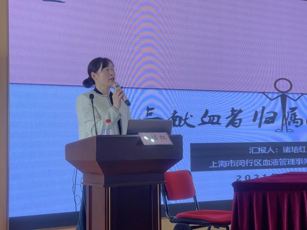 闵行区血液管理事务中心诸培红主任讲授了《提高献血者归属的策略与实践》,从无偿献血的起源、发展以及提高献血的内外政策环境等方面,解答了如何提高献血者的归属感,提升个人价值,充分发挥无偿献血的社会效应。
