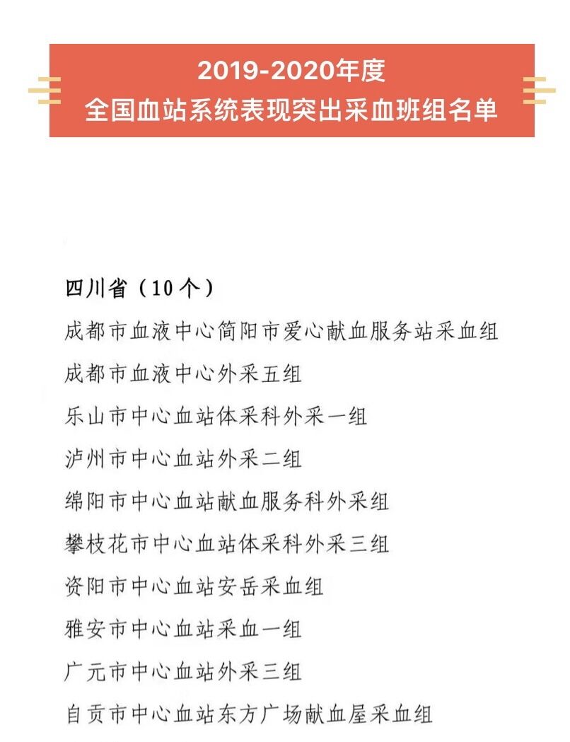 近日,在国家卫生健康委印发《关于通报表扬2019-2020年度全国血站系统表现突出采血班组的通知》中,广元市中心血站外采三组获得该项国家级奖项。