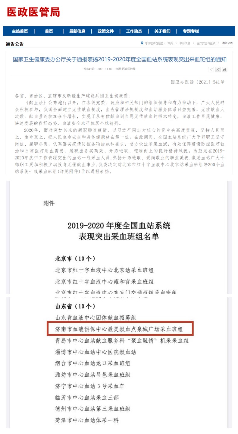 为鼓励在2019-2020年度中工作表现突出的血站一线采血人员,弘扬开拓进取、爱岗敬业的职业美德,激励血站广大干部职工更加积极主动地投身无偿献血事业,近日,国家卫生健康委办公厅下发了《关于通报表扬2019-2020年度全国血站系统表现突出采血班组的通知》。其中,济南市血液供保中心泉城广场采血班组榜上有名,这也是我中心继2018年后第二次获此殊荣。