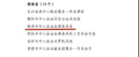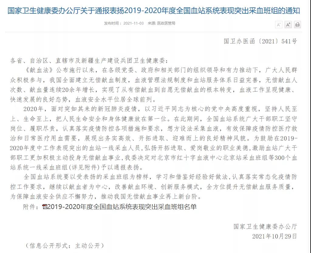 近日,国家卫生健康委官网发布《国家卫生健康委办公厅关于通报表扬2019-2020年度全国血站系统表现突出采血班组的通知》,株洲市中心血站血源体采室荣获“2019-2020年度全国血站系统表现突出采血班组”称号。