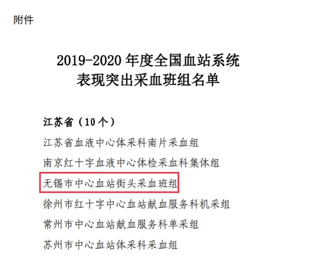 近日,国家卫生健康委、中国红十字会总会、中央军委后勤保障部卫生局联合下发《关于通报表扬全国表现突出采血班组的通知》,决定对全国300个采血班组予以通报表扬,无锡市中心血站街头采血班组榜上有名。
