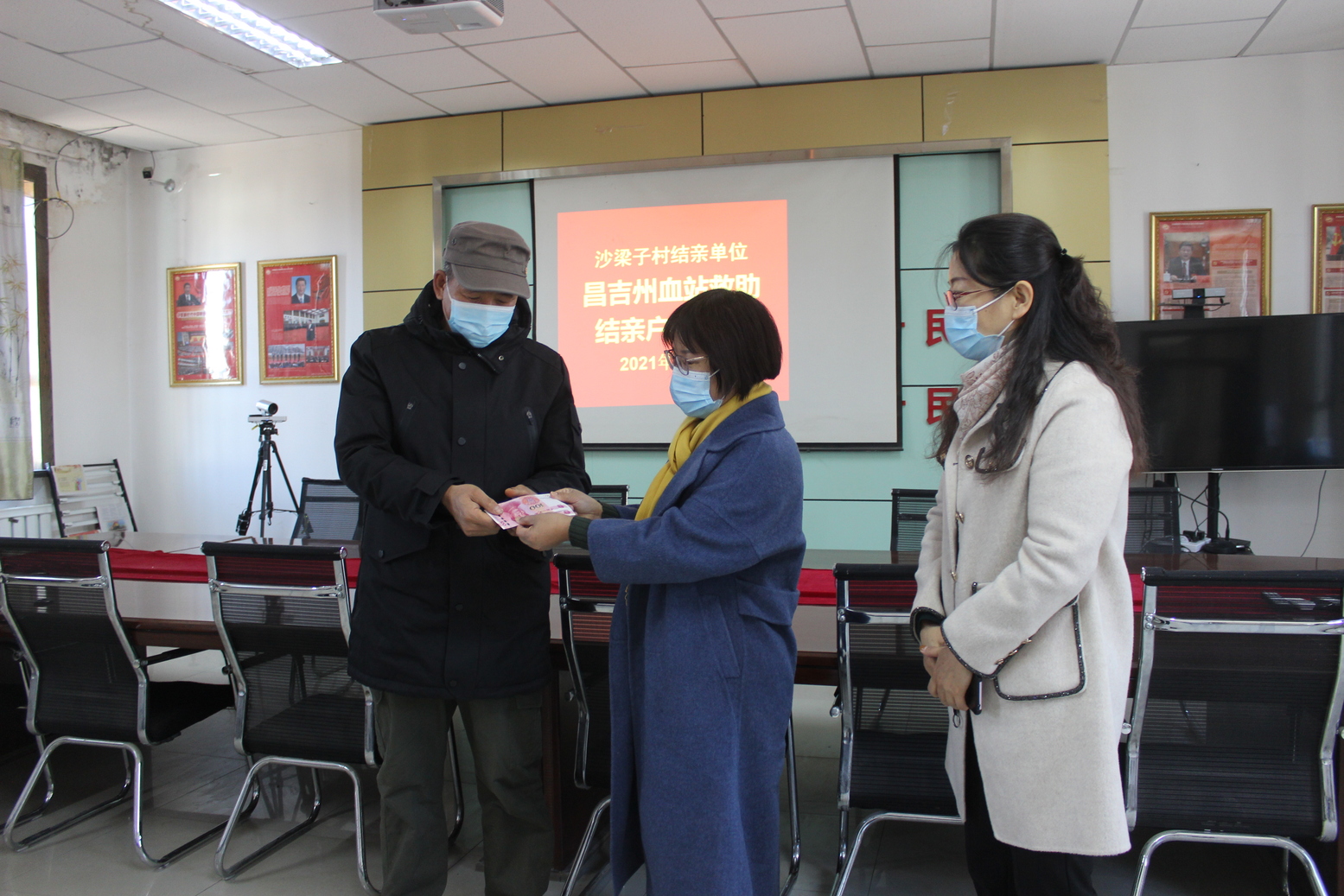昌吉州中心血站党支部将学习党史与为民办事实好事结合起来,用心、用情、用力为群众办实事。11月6日,州中心血站支部书记、站长姚秀丽一行带着1000元慰问金来到昌吉市六工镇沙梁子村委会,将血站的爱心慰问金交到马良秀家属手中,帮助和鼓励马良秀战胜病痛,早日康复。