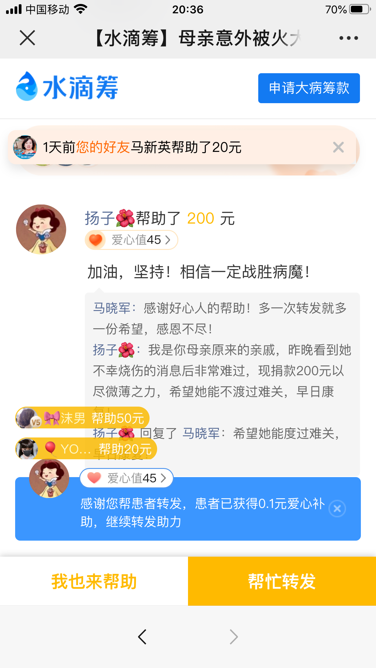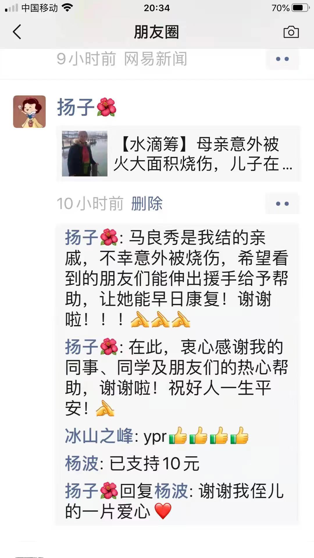 近日,沙梁子村干部的一条微信朋友圈链接:【水滴筹】母亲意外被火大面积烧伤,儿子在ICU外含泪求助!因家用锅炉爆炸,导致母亲马良秀大面积烧伤,求助人是马良秀的儿子马晓军。当看到这条消息,血站的干部职工坐不住了,“马良秀大姐挺好的,我们在她家住过多次,真是不幸,发个链接,我要捐款”、“希望看到的朋友们能伸出援手给予帮助,让她能早日康复!”大家纷纷通过转发链接、捐款,50元、200元……,尽已所能,共同帮助她度过难关,祝福马大姐早日康复。