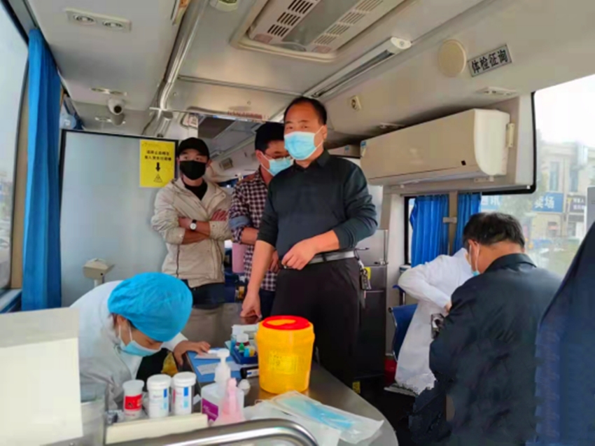 阴天气温偏低。但是依然有不少群众来到献血车旁,在巨野义工协会志愿者帮助下,有序开展献血活动。临近中午,董官屯镇党委书记李现棠和副书记赵英伟也利用下班时间加入献血队伍中。