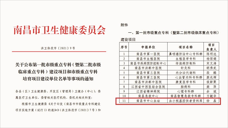 近日,从南昌市卫健委处传来喜讯,血站血小板基因供者资料库正式获批2021年市级重点专科建设项目。据了解,全市医疗卫生机构共有27个专科参与了2021年度市级重点建设专科的申报评比工作,经资料审查、专家评比及现场答辩等多重环节的严格甄选,其中11个专科入闱本年度市级重点专科建设项目。所有获批专科将以三年为期,以项目建设推动重点专科发展为路径,最终实现在重点专病、重点技术、重点项目等方面的突破,从而达到进一步提高我市专科临床服务能力的总体目标。