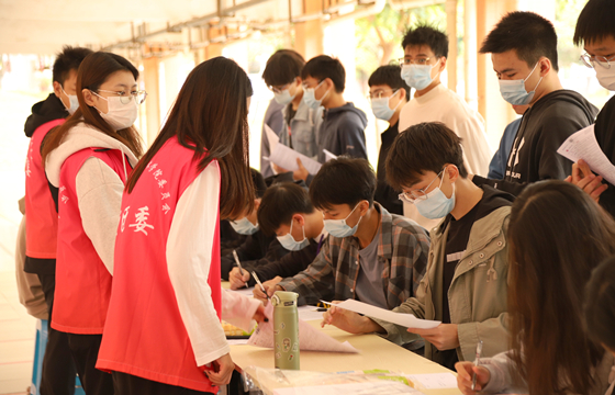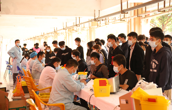 无偿献血摊位设置在饭堂旁边的宿舍楼楼下,同学们依次经历填表登记、初筛验血、健康征询等环节。同学们个个严守新冠肺炎疫情防控措施,戴好口罩、注意间隔距离、减少交谈等。在血站工作人员和学校校团委学生工作部门的志愿者指引下,青春洋溢的无偿献血队伍正有条不紊地顺利向前推进。