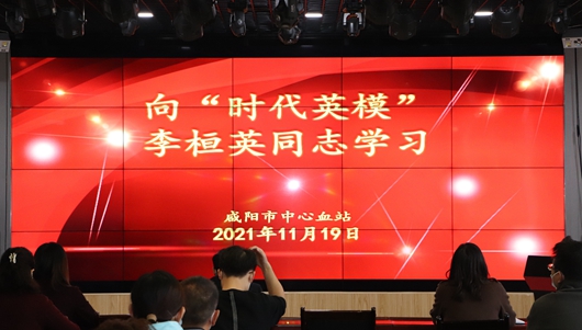 咸阳市中心血站以党史学习教育为抓手,号召全体职工学习李桓英同志“不忘初心、牢记使命”的爱国情怀,弘扬时代楷模精神,心系无偿献血,立足岗位做出新贡献。11月19日,全站党员干部职工线下观看《时代楷模李桓英》节目,以播放宣传片等形式,营造向榜样学习的良好氛围。