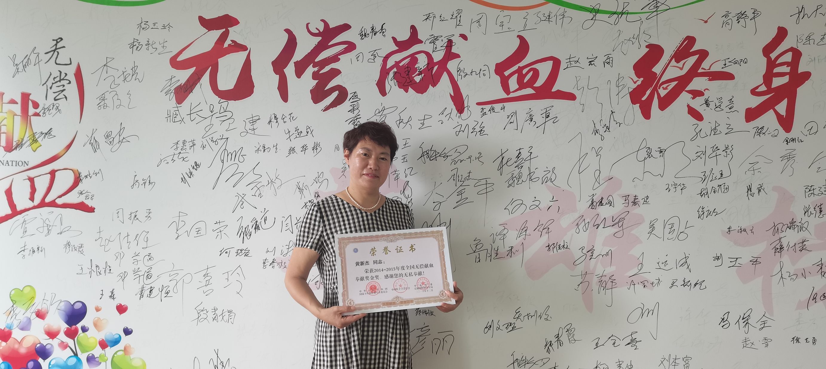 黄新杰是我市众多无偿献血志愿者中的一位,多年来,她默默无闻、无私奉献,累计捐献全血8200ml,成分血12个治疗量,这一个个饱含分量的数字背后,是一名普通献血志愿者17年的默默奉献与执着。黄新杰曾先后获得由国家卫健委、中国红十字总会、中央军委后勤保障部卫生局联合颁发的无偿献血奉献奖铜奖、银奖和金奖。