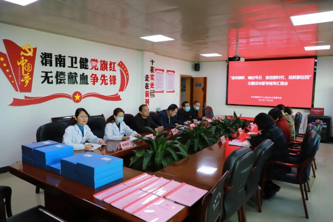 11月22日下午,渭南市卫健委四级调研员常芳娥、健康促进科副科长杨琳、三级主任科员吴丹一行三人,督导检查市中心血站“高举旗帜,响应号召,奋进新时代,启航新征程”主题活动开展情况。市中心血站党总支书记、站长严胜利主持汇报,血站领导班子成员参加会议。
