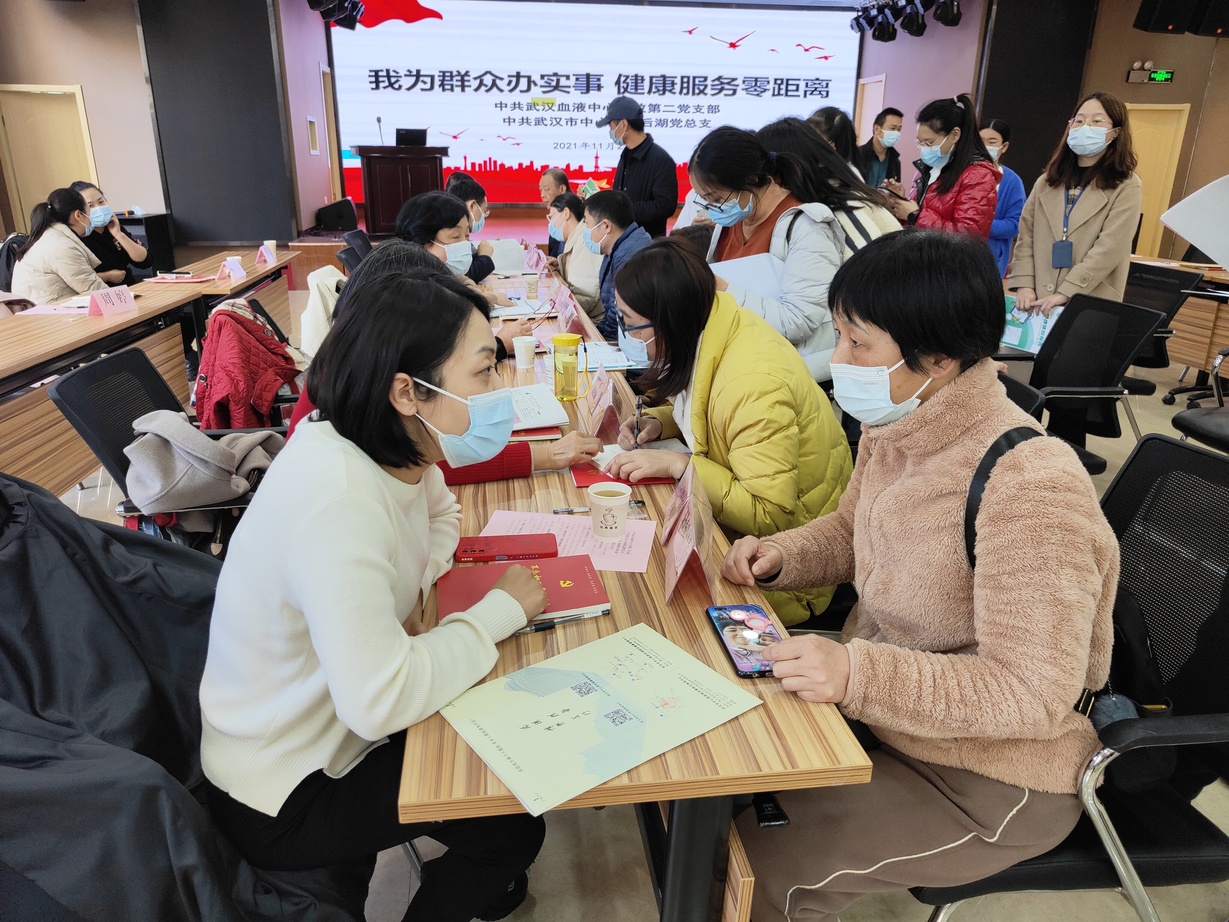 为贯彻落实“我为群众办实事”与业务工作同频共振,结合献血者及血液中心职工的健康需求,11月23日,武汉血液中心行政第二党支部联合武汉市中心医院后湖党总支联合开展了“同心向党润初心、健康服务零距离”主题党日活动。活动当天,血液人、无偿献血者、临床医生三方面对面交流了健康管理及血液科普知识。结合自身专长,临床医生还为在场人员开展了一对一的健康咨询服务,现场气氛十分热烈。
