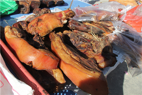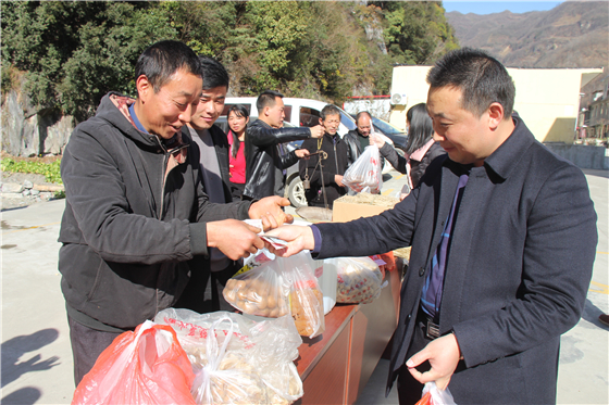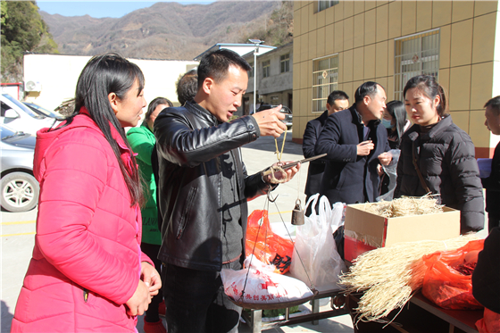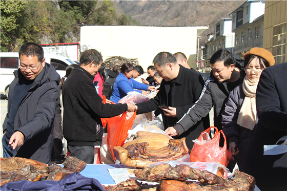 随后的认购活动现场热闹非凡,村民们早早将各种农副产品摆放整齐,一筐筐红辣椒、白萝卜、熟透的柿子、色泽诱人的秘制腊肉、野生蜂蜜、自酿杆杆酒、现杀土猪肉等天然无公害的“土山货”让人样样都想带回家。这些农副产品在短短两个小时内就被抢购一空,交易额达2.3万余元,真正让农户手中的“土山货”变成了“金元宝”。