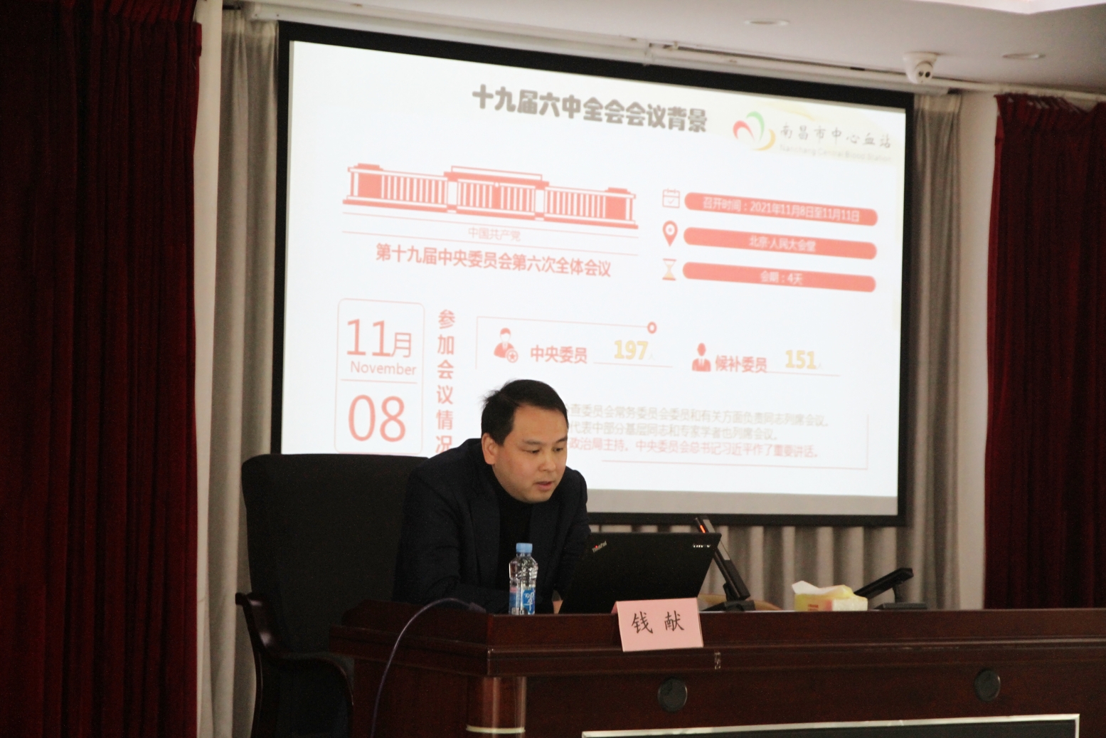 12月8日,南昌市中心血站开展基层书记讲党课活动,深入学习党的十九届六中全会、省十五次党代会、市第十二次党代会精神,血站党员干部、职工103人参加。