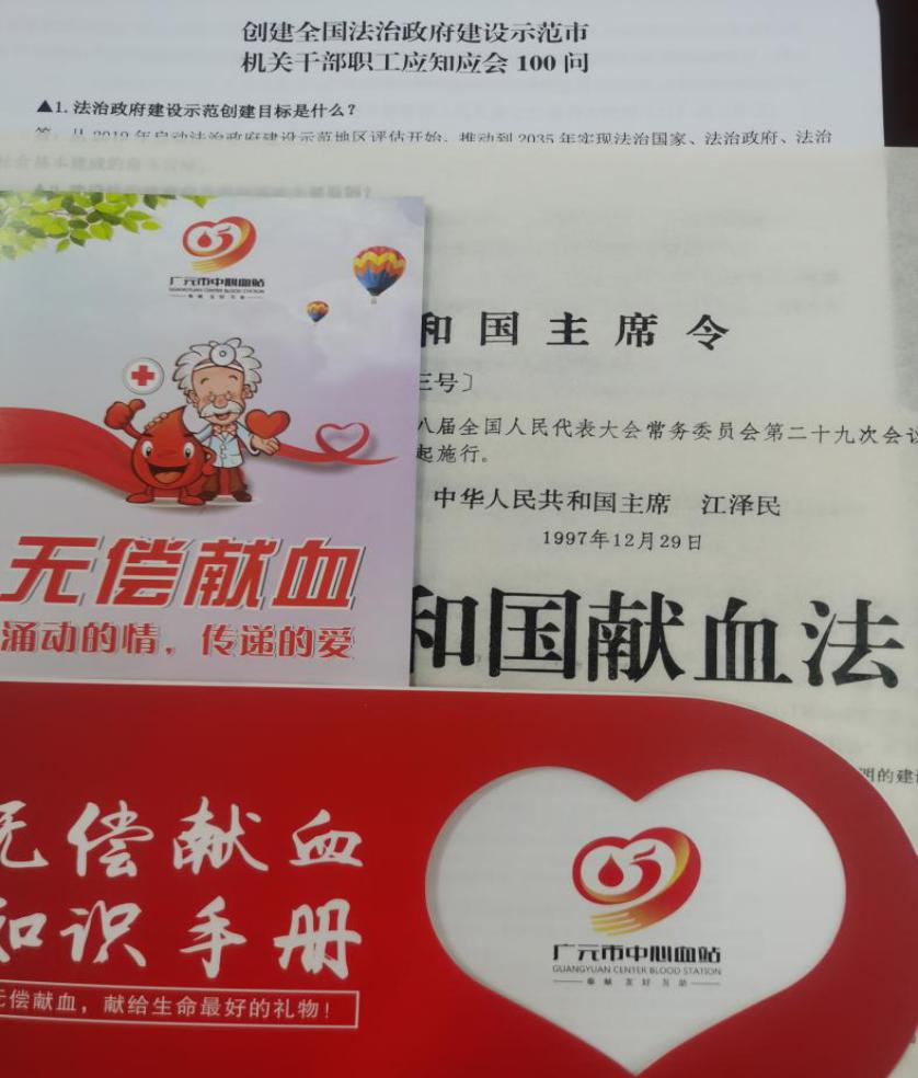 重视学习教育。将《宪法》《献血法》《民法典》《安全生产法》《生物安全法》等法律法规纳入全年培训范畴,通过会前学习、邀请专家集中授课等方式提升法治建设水平,印制《创建全国法治政府建设示范市机关干部应知应会100问》3000余册,分发到每一位干部职工手中,并在采血一线向献血者和广大群众发放。