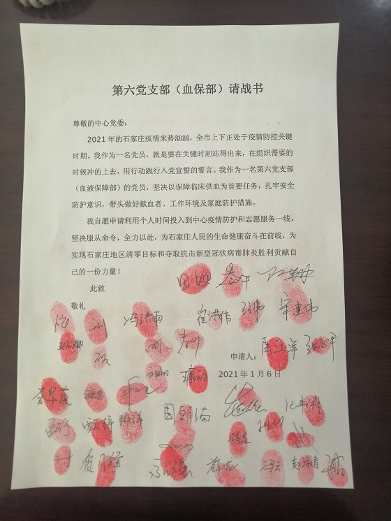 2021年初,伴随着石家庄地区第一例新冠肺炎确诊病例的报告,全省全市迅速进入备战状态,石家庄市各区市县实行分区分级严格管控措施,采供血工作面临着极大的挑战。第六党支部及所在科室同志率先响应中心党委号召,迅速递交请战书,表达了“若有战、召必去、战必胜”的信心和决心。支部书记陆江洋同志身先士卒,从疫情开始到结束三十多天的时间里,从未离开过工作岗位,吃住在单位,带领支部委员逐村逐点勘察路线,掌握县市区、乡镇农村的防疫防控形势,全身心投入到疫情期间血液保障的工作中。在居家隔离防控疫情措施执行后,党员同志们积极请战参与值守,舍小家顾大家,组建党员突击队,冲锋到采血一线,在精选23名在岗隔离并工作的同志中,党员占到61%,大家白天跟车外出采血,晚上回到单位交流谋划,为采集到安全的血液、保障好血液供应任务日夜兼程。