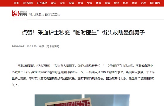 近年来,在外出采血过程中,工作人员数十次对需要帮助的群众伸出援手。2018年10月11日,河北新闻网有这样一篇文章《点赞!采血护士秒变“临时医生”街头救助晕倒男子》引起社会关注,六支部积极分子李翠英、采血护士高欣以及司机张晓磊遇路人求助,立即赶往现场,确定男子全身抽搐、意识丧失,她们迅速反应,疏散群众,轻扶男子身体制动,紧急拨打120急救,同时为他清理伤口,待急救车到来,三人协助医务人员将男子安全转运,她们的施救行为虽是本能所致,但更深刻地沉淀了冀血人强烈的职业使命感和责任感。