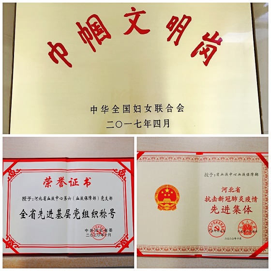 事争一流,唯旗是夺,第六党支部用自己的实际行动与积极付出收获到诸多荣誉。被河北省省委、省政府评为2020年“河北省抗击新冠肺炎疫情先进基层党组织”;多次被评为中心的“先进党支部”、“五好红旗党支部”荣誉称号,其所在科室血液保障部荣获2017年度“全国巾帼文明岗”荣誉称号、2020年度“河北省抗击新冠肺炎疫情先进集体”、“省级青年文明号”等荣誉。
