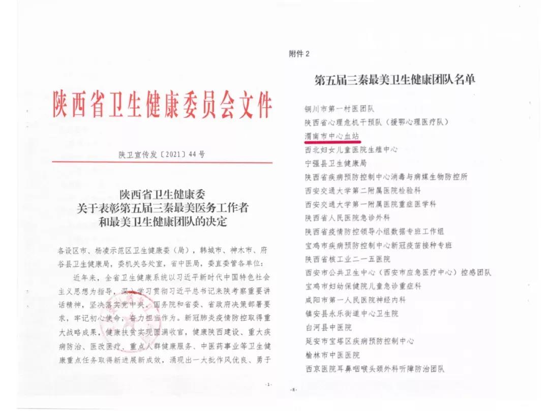 8月17日,陕西省卫生健康委发布“关于表彰第五届三秦最美医务工作者和最美卫生健康团队的决定”,渭南市中心血站作为渭南市唯一上榜单位荣获“第五届三秦最美卫生健康团队”荣誉称号。
