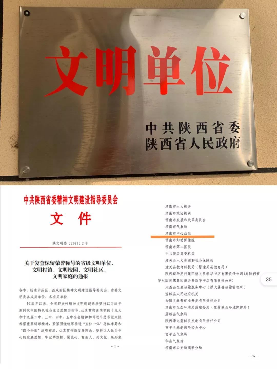 陕西省委精神文明建设指导委员会印发《关于复查保留荣誉称号的省级文明单位、文明村镇、文明社区、文明家庭的通报》(陕文明委[2021]2号),渭南市中心血站顺利通过陕西省文明委“省级文明单位”复查验收,继续保留“省级文明单位”荣誉称号。