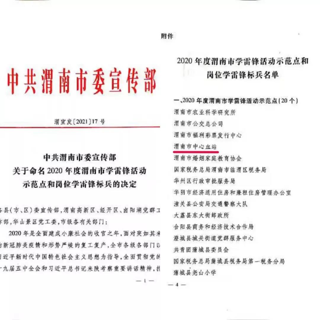 为进一步弘扬新时代雷锋精神,积极培育和践行社会主义核心价值观,持续推进学雷锋活动深入开展,营造人人践行雷锋精神、争创一流业绩的浓厚氛围,近日,中共渭南市委宣传部命名20个单位为“2020年度渭南市学雷锋活动示范点”,渭南市中心血站名列其中。