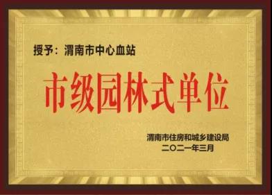 渭南市中心血站积极开展园林式单位、园林式居住区创建活动,2021年3月被渭南市住房和城乡建设局评为“渭南市市级园林式单位”。