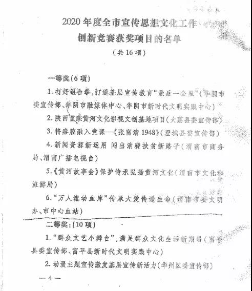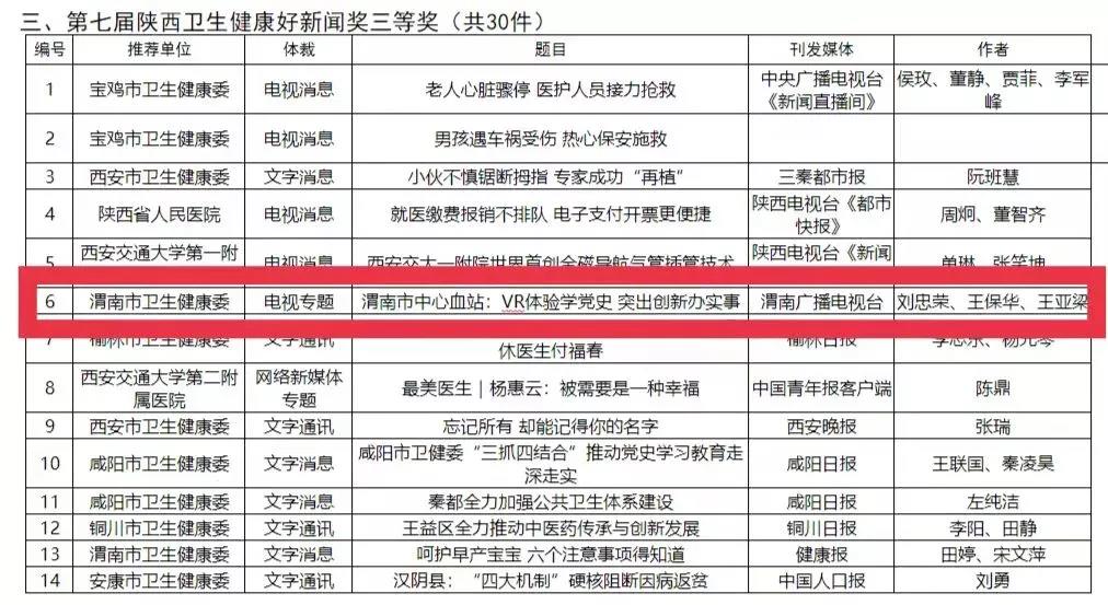 由渭南市卫健委选送的“渭南市中心血站:VR体验学党史 突出创新办实事”电视专题作品,荣获“第七届陕西卫生健康好新闻奖”三等奖。