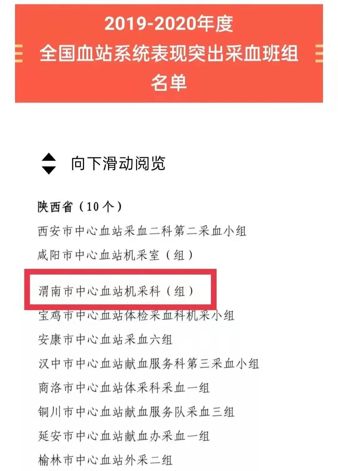 为鼓励在2019-2020年度中工作表现突出的血站一线采血人员,弘扬开拓进取、爱岗敬业的职业美德,激励血站广大干部职工更加积极主动投身无偿献血事业,国家卫生健康委办公厅下发了《关于通报表扬2019-2020年度全国血站系统表现突出采血班组的通知》。渭南市中心血站机采科位列其中。