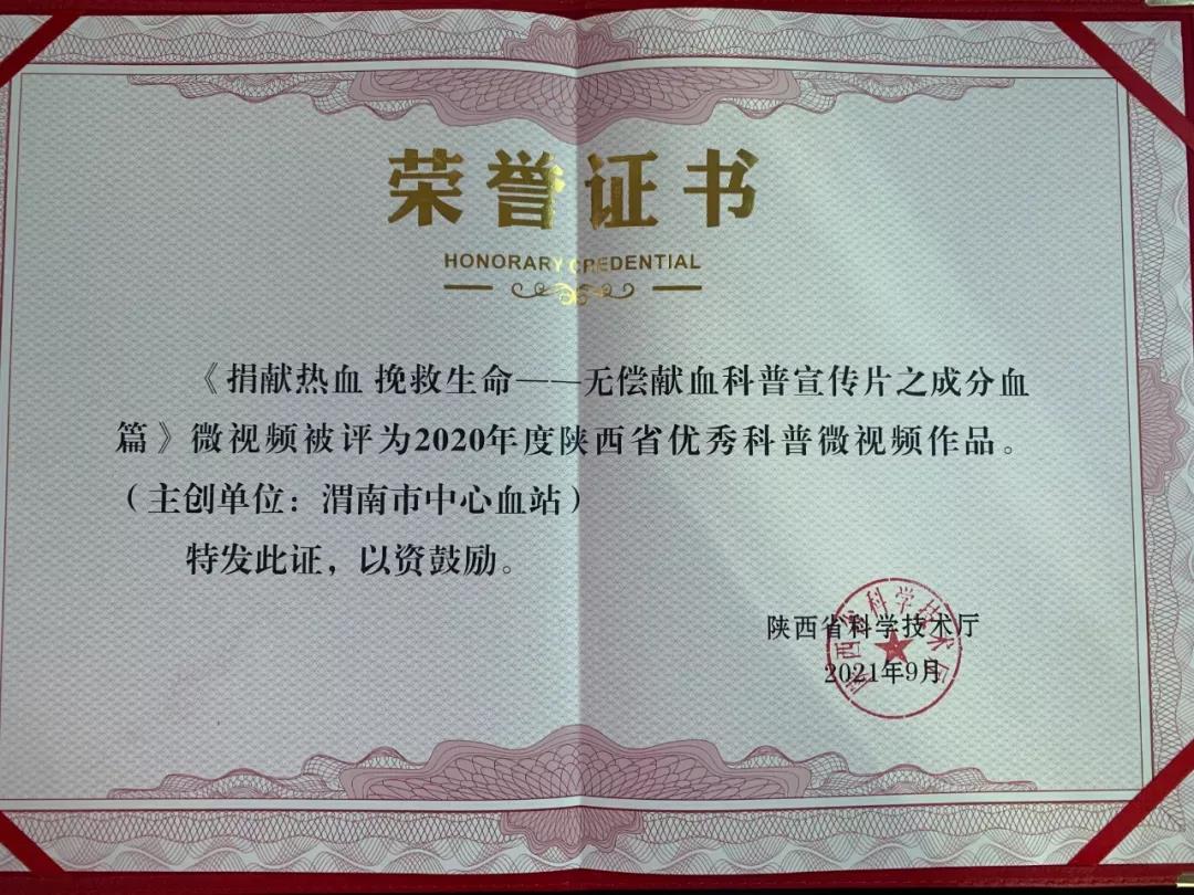 ”由陕西省科学技术厅举办的“2020年度陕西省科普微视频大赛”,经形式审查、专家评审,由渭南市中心血站选送的《捐献热血 挽救生命——无偿献血科普宣传片之成分血篇》微视频在全省64家单位推荐的133部作品中脱颖而出,被评为2020年度陕西省优秀科普微视频作品,向社会推荐宣传。