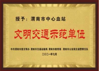 11月24日,在“2021平安三秦行”陕西省122全国交通安全日主题活动现场,中共陕西省委精神文明建设指导委员会办公室、陕西省教育厅、陕西省公安厅、陕西省交通运输厅联合表彰了2021年度陕西省文明交通示范创建活动先进典型。渭南血站是渭南市唯一一家荣获“省级文明交通示范单位”荣誉称号的单位。