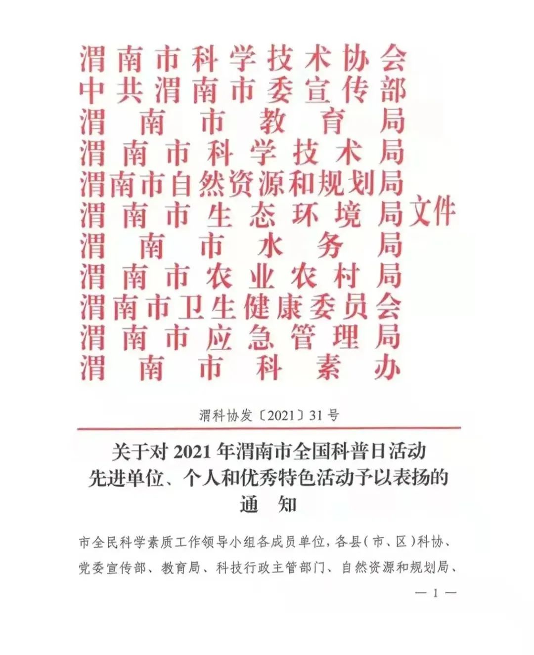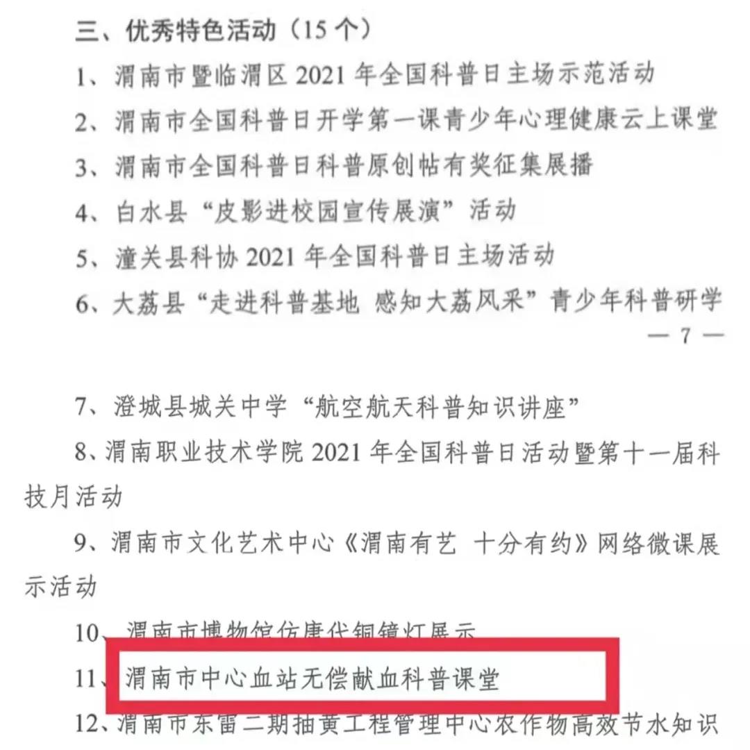 渭南市科学技术协会、渭南市委宣传部等十一个单位联合发布《关于对2021年渭南市全国科普日活动先进单位、个人和优秀特色活动予以表扬的通知》,渭南市中心血站无偿献血科普教育基地荣获2021年渭南市全国科普日活动“先进单位”、渭南市中心血站无偿献血科普课堂荣获“优秀特色活动”。