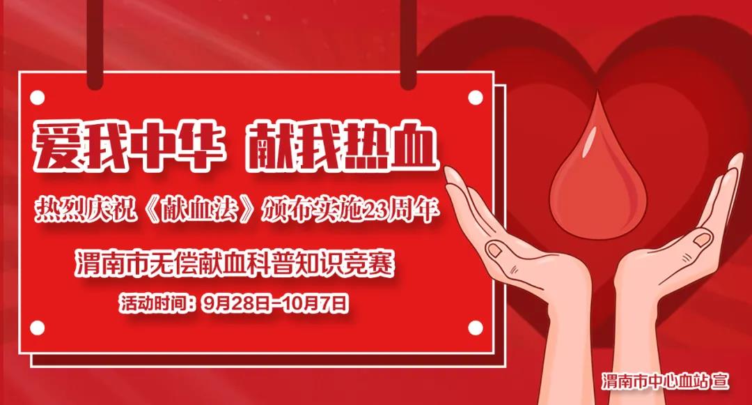 为庆祝中华人民共和国成立72周年和《中华人民共和国献血法》颁布实施23周年,开展了为期10天的线上“爱我中华 献我热血”渭南市无偿献血科普知识竞赛活动。此次活动得到了众多爱心市民的积极参与,提高了市民无偿献血知晓率和参与度。