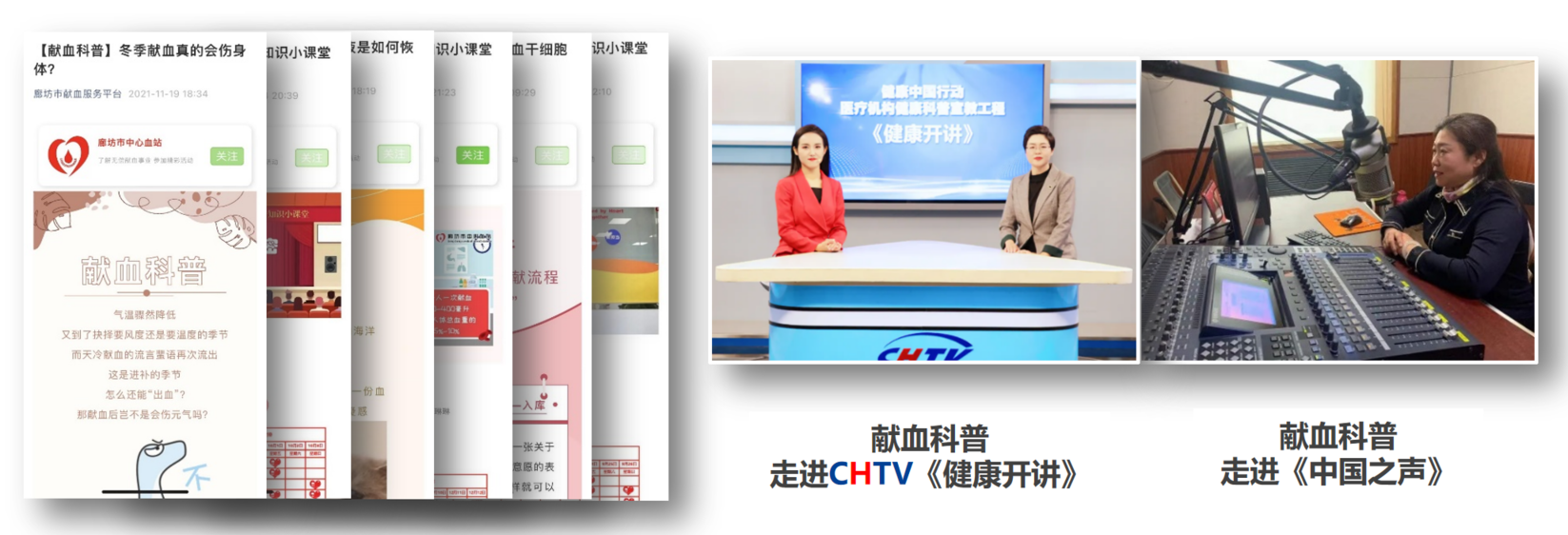 重科普强宣教,无偿献血社会氛围日益浓厚。为适应融媒体时代的节奏,不断创新自媒体宣传模式,宣传工作转变思维模式。结合团采集体、血站开放日、“6.14”世界献血日等各类主题活动,充分利用视频号、微视频、抖音等自媒体发挥宣传作用,持续带动市民的献血热情。开展以“庆祝世界献血者日,喜迎建党100周年”为主题开展一系列形式多样、丰富多彩的活动,其中制作的快闪《红色大爱 血脉相连》在无偿献血宣传科普在线公众号、河北省血液中心视频号、廊坊发布、健康廊坊 健康家庭视频号、廊坊无偿献血服务平台一经播出,累计观看达11157人次。 6.14期间,开启“点亮廊坊”灯光秀活动、第六届“点亮中国”世界献血者日活动,持续推动无偿献血理念持续深入人心。