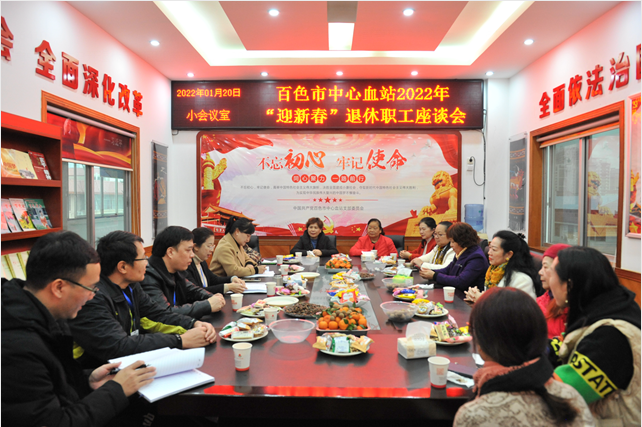 1月20日上午,百色市中心血站2022年“迎新春”退休职工座谈会在单位小会议室召开。站领导、支委、部分科室负责人及退休职工在新春佳节来临之际,欢聚一堂,聊退休后生活,谈血站发展,共迎壬寅虎年。