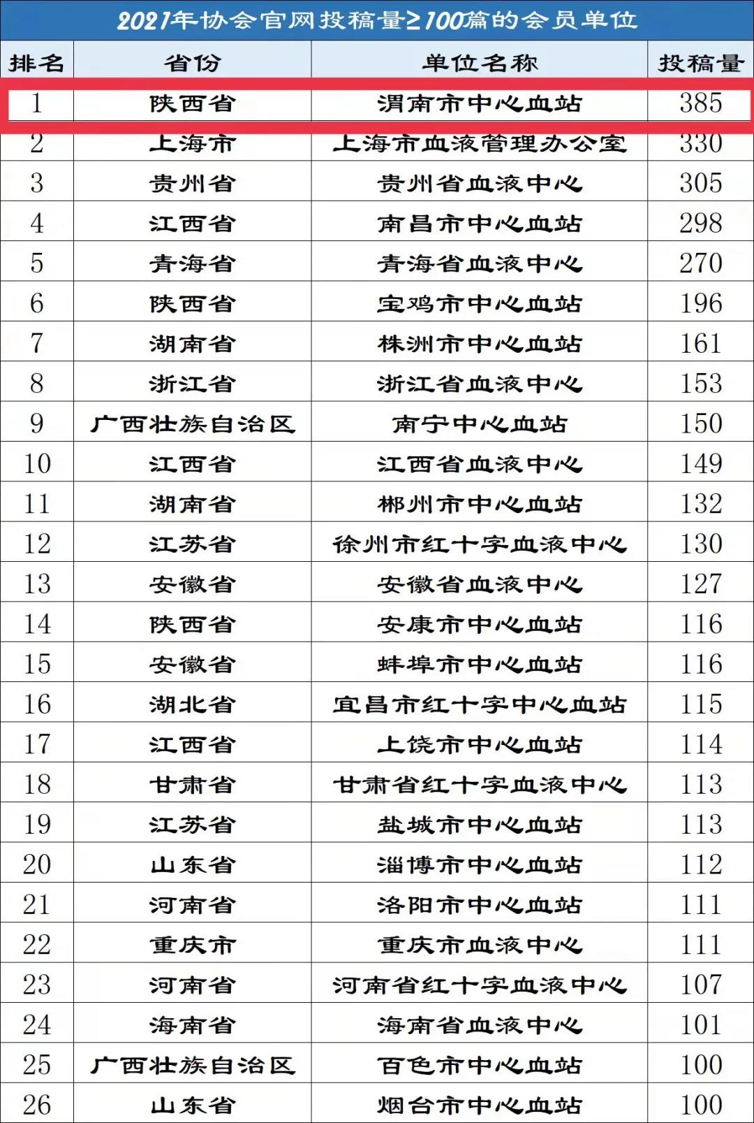 日前,中国输血协会官网公布了2021年发稿排行榜,渭南市中心血站投稿385篇位列全国首位,在全国输血行业内扩大了渭南无偿献血工作的影响力和知名度。