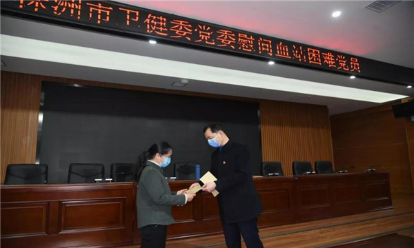 李晓兵代表卫健委党委对血站两名困难党员进行慰问,并致以节日祝福。