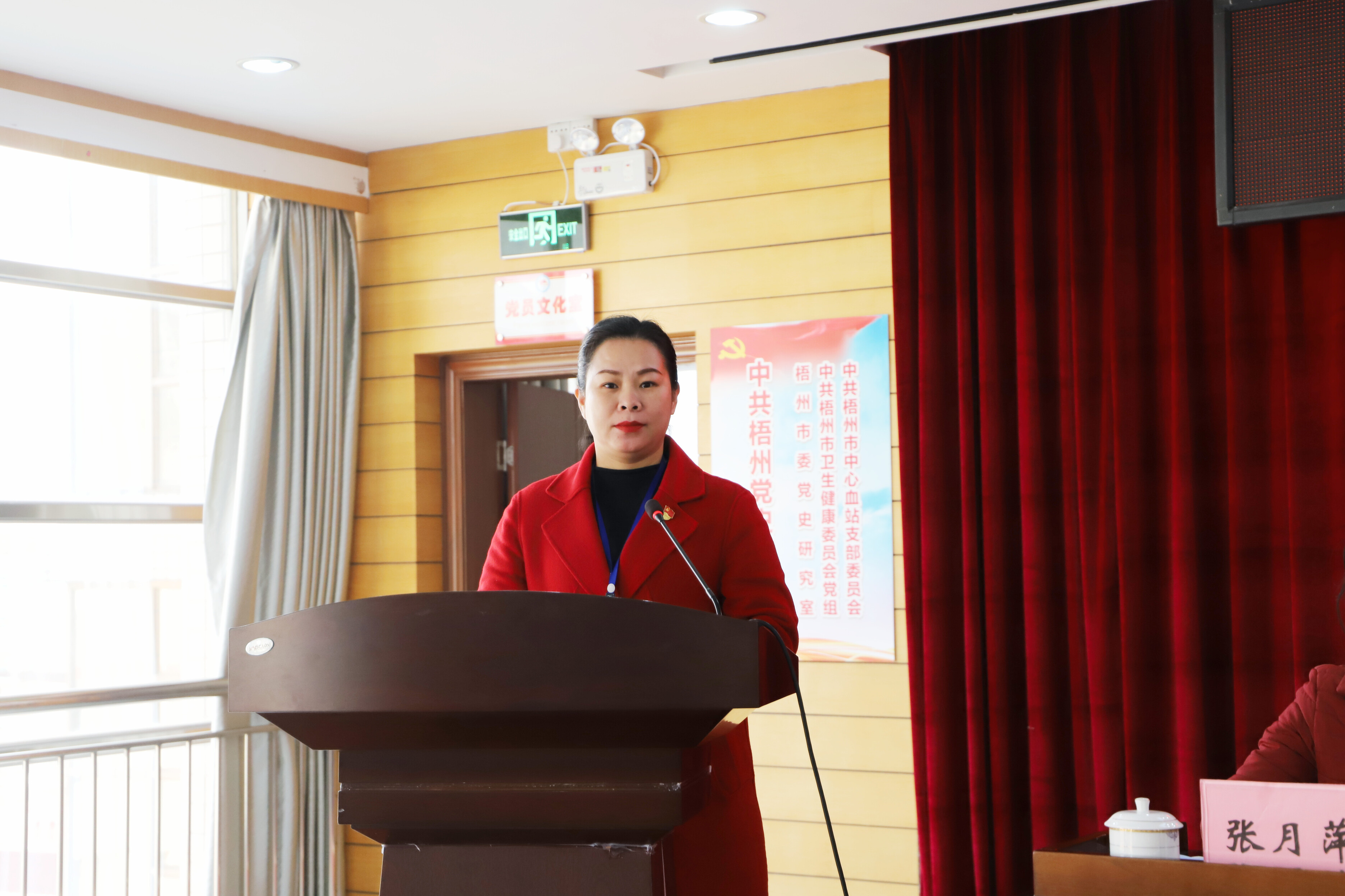 大会在雄壮激昂的《国歌》声中拉开帷幕。血站党支部书记黄芳为大会致开幕辞。